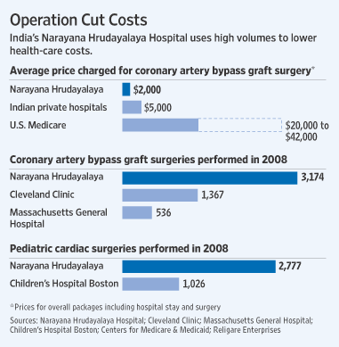 Dr. Devi Shetty and Narayana Hrudayalaya are applying the very same principles to cardiac surgery. Narayana’s 42 cardiac surgeons performed 3,174 cardiac bypass surgeries in 2008, more than double the 1,367 the Cleveland Clinic, a U.S. leader, did in the same year. His surgeons operated on 2,777 pediatric patients, more than double the 1,026 surgeries performed at Children’s Hospital Boston.